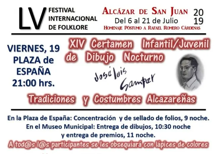 La Asociación de Coros y Danzas de Alcázar de San Juan celebrará este viernes, a partir de las nueve de la noche en la Plaza de España, la XIV edición del Certamen Infantil/Juvenil de Dibujo Nocturno “José Luis Saper”, una actividad que se enmarca dentro de los Escenarios de Verano del Patronato Municipal de Cultura y que se celebra de forma simultánea con el Certamen de Pintura Rápida Nocturna “Ángel Lizcano Monedero”.