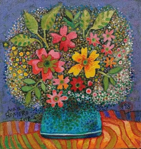 “La gran grúa” es el título de un óleo de Juan Romero de su etapa en París y otro más actual “Florero con vaso azul”.