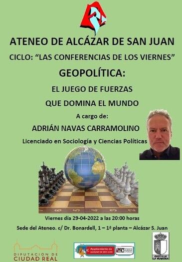 El Ateneo de Alcázar ha vuelto a organizar uno de sus actos dentro del ciclo “Las conferencias de los viernes”, en esta ocasión con el licenciado en Sociología y Ciencias Políticas, Adrián navas Carramolino, que ofrecerá una conferencia sobre “Geopolítica: El juego de fuerzas que domina el mundo”.