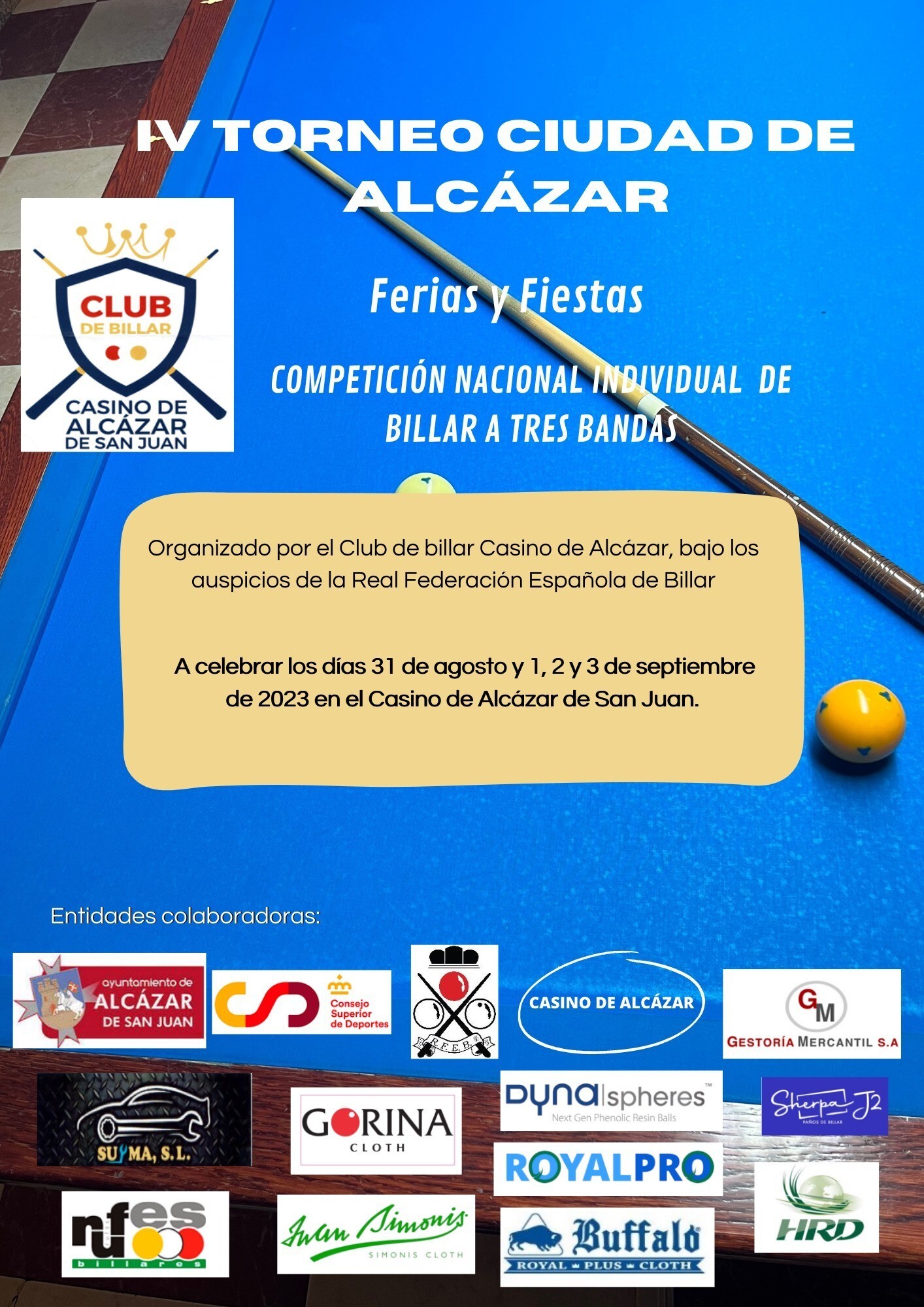 Con motivo de las próximas Ferias y Fiestas, el Club del Casino de Alcázar ha organizado su tradicional Torneo de Billar a tres bandas, que este año celebra su IV edición. Si anteriormente el Torneo se limitaba a jugadores de la región, este año el Club ha dado un paso más ampliando la competición a todos los billaristas residentes en España, de cualquier categoría. Ha sido homologado y difundido por la Federación Española de Billar.