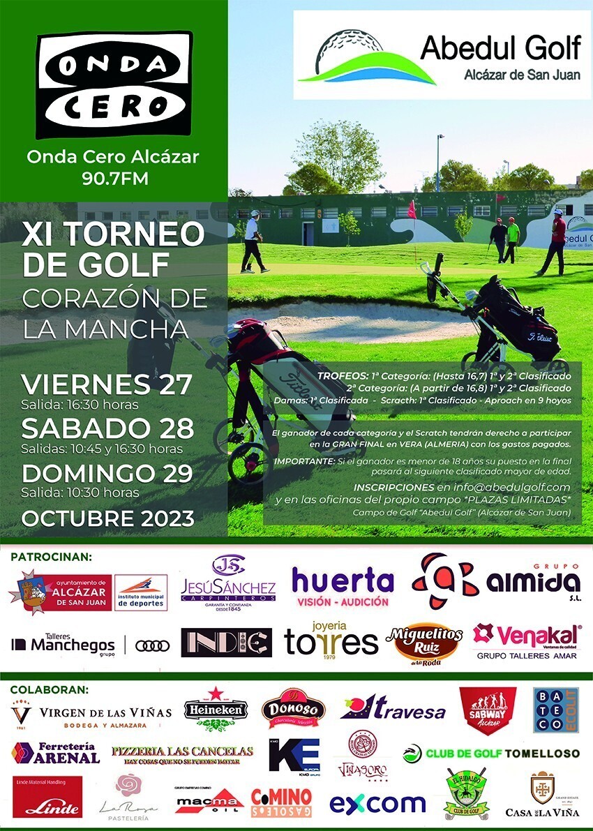Onda Cero Alcázar, con el apoyo de diferentes entidades e instituciones de la comarca, organiza un año más, la undécima edición del Torneo de Golf “Corazón de la Mancha”, un prestigioso Torneo, que se celebrará en Abedul Golf los próximos viernes 27, sábado 28 y domingo 29.