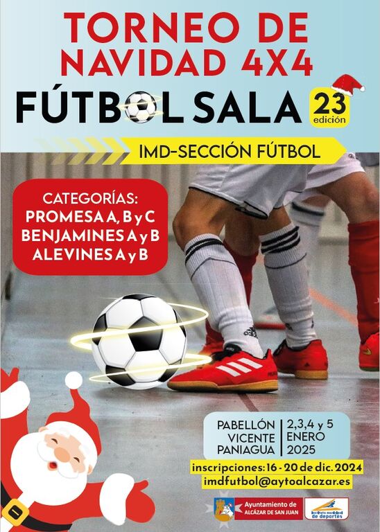 Como ya es tradición en los primeros días del nuevo año en Alcázar de San Juan, se celebrará el Torneo de Navidad de Fútbol Sala 4×4, que, este año 2025 alcanzará su 23ª edición. El fútbol-sala volverá a ser el protagonista deportivo en el inicio del nuevo año.