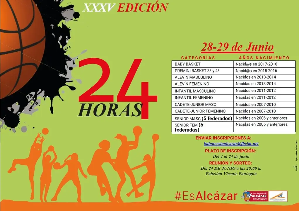 Como es habitual en estas fechas del mes de junio, Alcázar de San Juan prepara sus tradicionales y populares 24 horas de baloncesto, que en este año 2025, celebrará su XXXV Edición. Una de las principales novedades de este año, es que se posponen al último fin de semana del mes de junio, por lo que se realizarán los días 28 y 29 de junio en las instalaciones deportivas municipales, complejo polideportivo municipal, y pabellones de la ciudad.