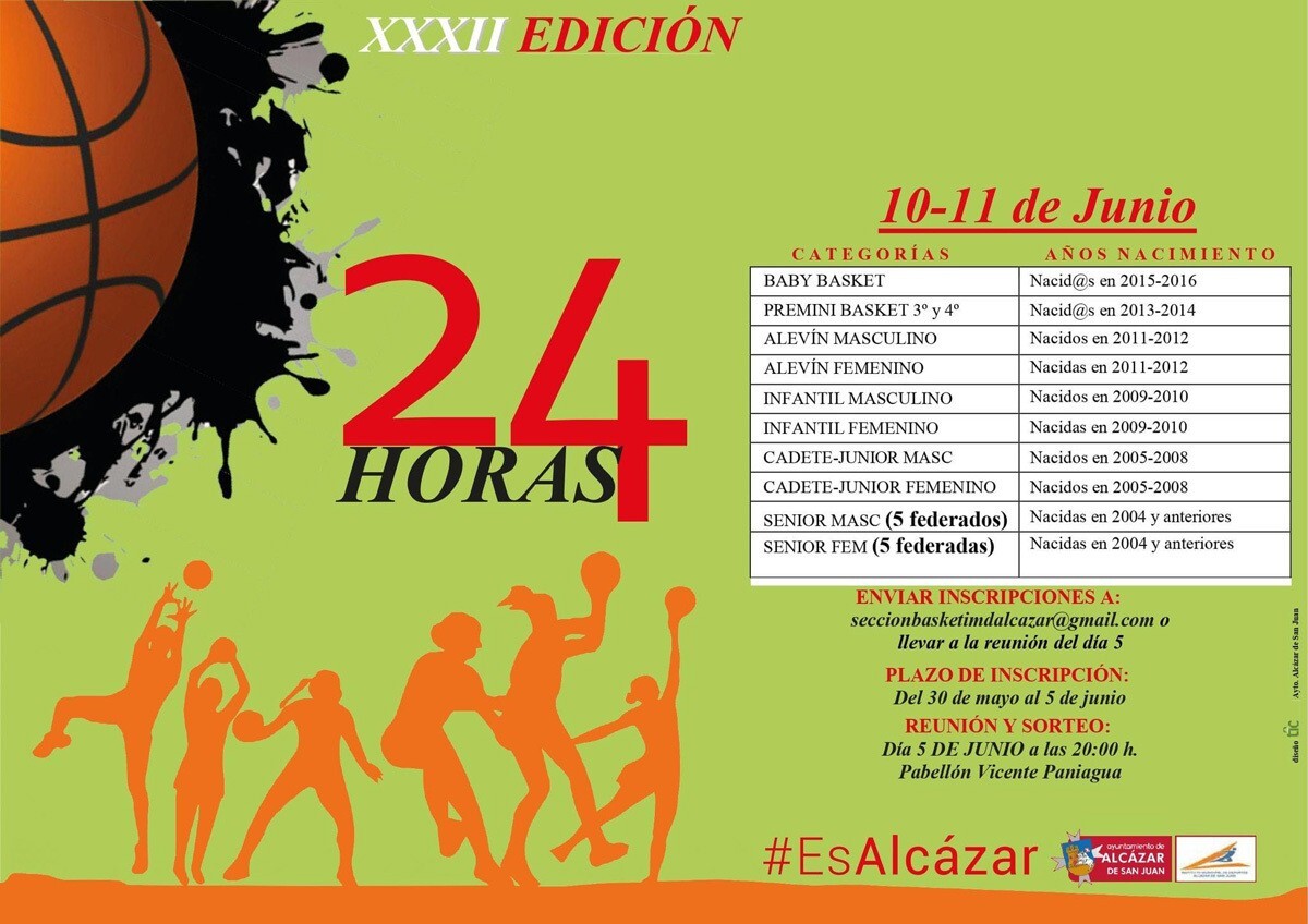 La Sección de Baloncesto del Instituto Municipal de Deportes del Ayuntamiento de Alcázar de San Juan ha abierto el plazo de inscripción para inscribirse en las tradicionales 24 horas. Un Torneo fiesta fin de temporada del baloncesto alcazareño que este año se celebrará el 10 y 11 de junio y que alcanza su trigésimo segunda edición.