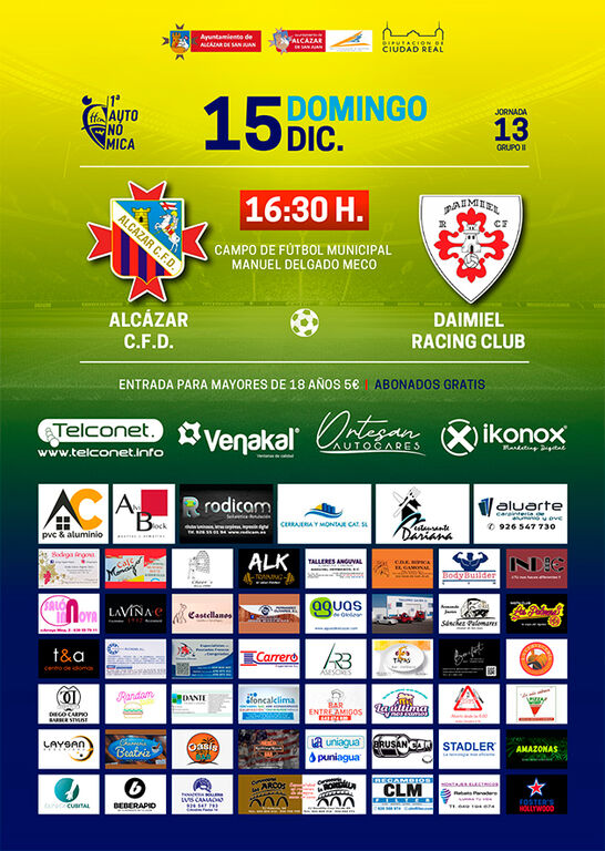 Este domingo a las 16:30 horas, en el Municipal Manuel Delgado Meco de Alcázar se disputará el partido de fútbol de la Jornada 13 de la Primera Autonómica, entre los equipos Alcázar CFD y Daimiel Racing Club, ambos conjuntos encuadrados en el grupo 2 de la citada categoría. El partido será dirigido por el colegiado Youssef El Alami.