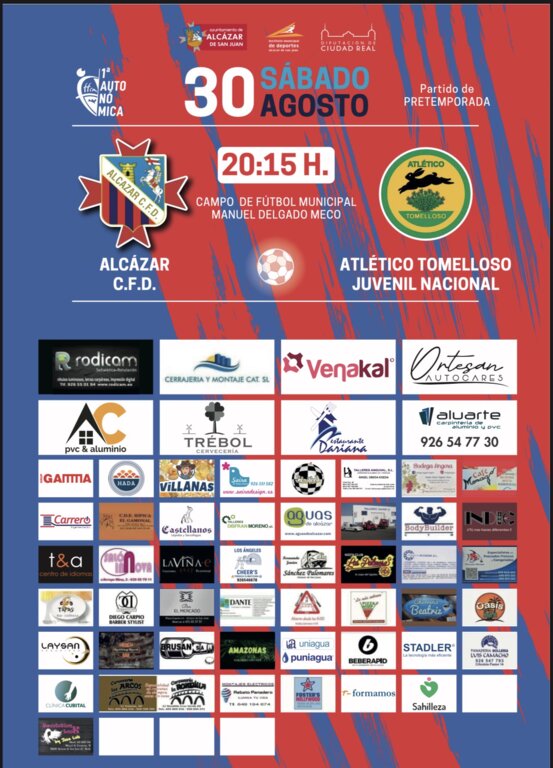 Este sábado 30 de agosto a las 20:15 horas, el Campo de Fútbol Municipal Manuel Delgado Meco será el escenario de un nuevo amistoso de pretemporada para el Alcázar CFD, que se enfrentará al Atlético Tomelloso Juvenil Nacional. El choque servirá como última prueba antes del tradicional Trofeo de Ferias, cita marcada en rojo en el calendario de los locales.
