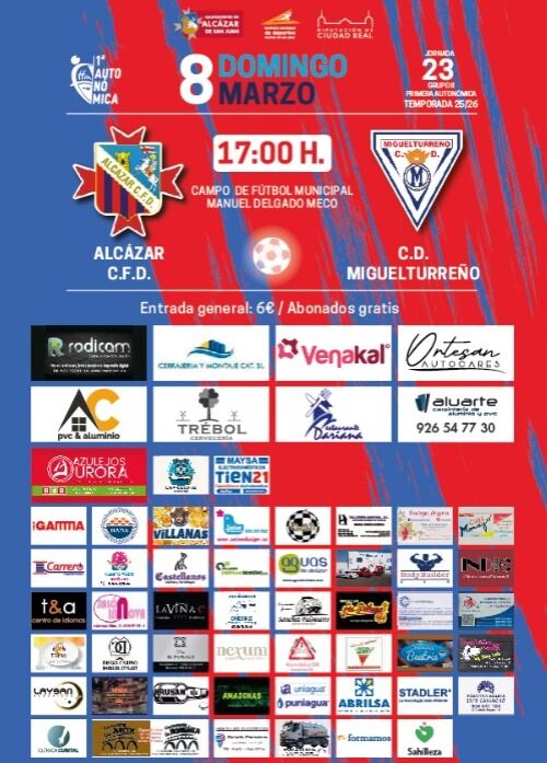 Con la clara intención de acabar con la mala racha de juego y resultados, y, sobre todo, la mala situación por la que atraviesa el equipo, que parece que le ha mirado “un tuerto” porque casi todo le sale mal, lesiones, sanciones, etc…, el Alcázar CFD, quiere hacer borrón y cuenta nueva este domingo en su partido de la vigésimo tercera jornada de liga frente al CD Miguelturreño, a partir de las 17:00 horas con arbitraje de Miguel García España que estará asistido por Francisco J. Campos Lara y Fernando Moreno Osuna.