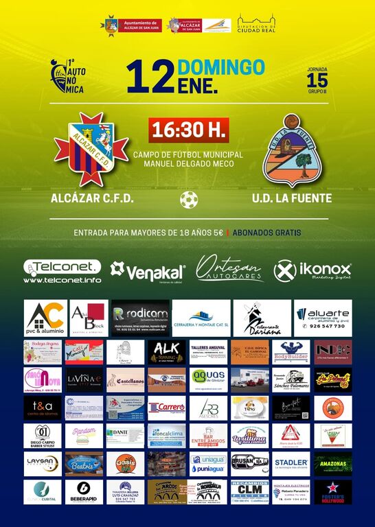 Este próximo domingo 12 de Enero, en el Municipal Delgado Meco de Alcázar de San Juan, a partir de las 16:30 horas, se disputará el partido de fútbol de la Jornada 15 de la Primera Autonómica, entre los equipos Alcázar CFD y UD La Fuente, ambos conjuntos encuadrados en el grupo 2 de la citada categoría. El partido será dirigido por el Ángel Rodríguez Sánchez.