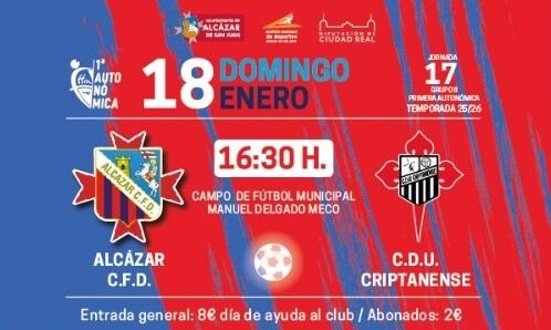 El partido, correspondiente a la 17ª jornada de liga, declarado como Día de Ayuda al Club por la junta directiva alcazareña, tendrá una entrada para Abonados de 2 € y general, para mayores de 18 años de 8 € y se disputará a partir de las 16:30 horas en el municipal “Manuel Delgado Meco” con arbitraje de José Alberto Díaz Fernández, que estará asistido en bandas por Álvaro Barrajón López y Julián Tebar Torres.