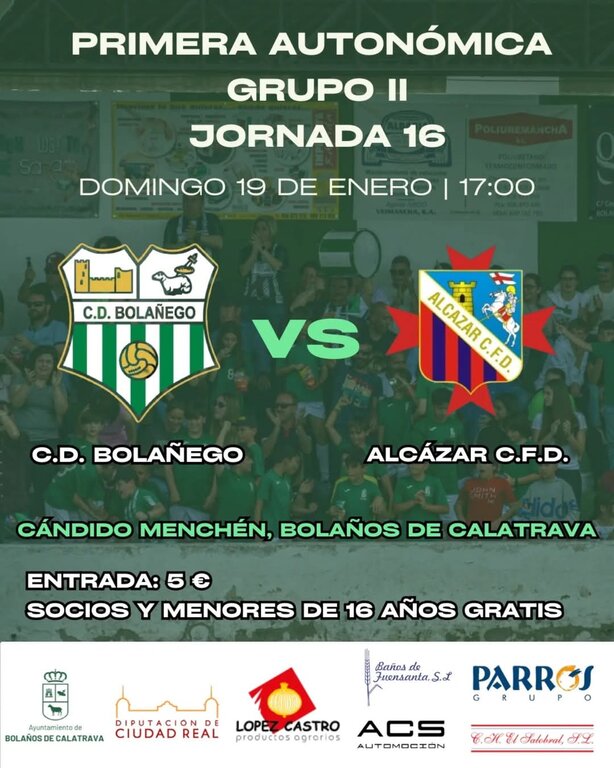 El Alcázar CFD, con la ilusión de brillar y disfrutar, se desplaza este domingo a Bolaños de Calatrava, donde, a partir de las 17 horas en el Municipal Cándido Menchén de Bolaños de Calatrava, disputará el partido de fútbol de la Jornada 16 de la Primera Autonómica y el primero de la segunda vuelta, entre los equipos CD Bolañego y Alcázar CFD, ambos conjuntos encuadrados en el grupo 2 de la citada categoría. El partido será dirigido por el colegiado Alberto Imedio Baladrón.