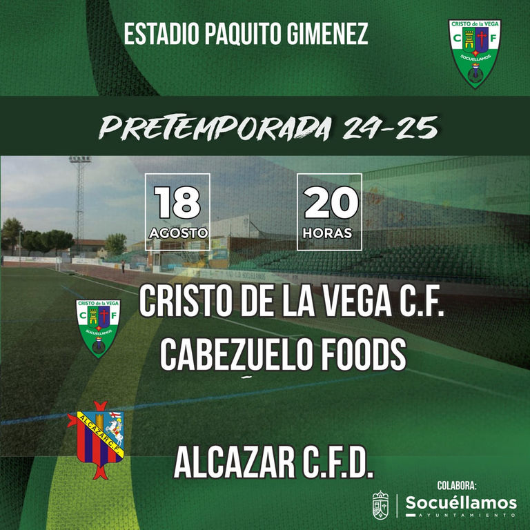 Este domingo, a partir de las 20:00 horas en el municipal Paquito Giménez de la localidad ciudadrealeña de Socuéllamos, el equipo de Primera División Autonómica del Alcázar CFD disputará su segundo test amistoso de pretemporada frente al Cabezuelo Foods Cristo de la Vega CF de Segunda División Autonómica.