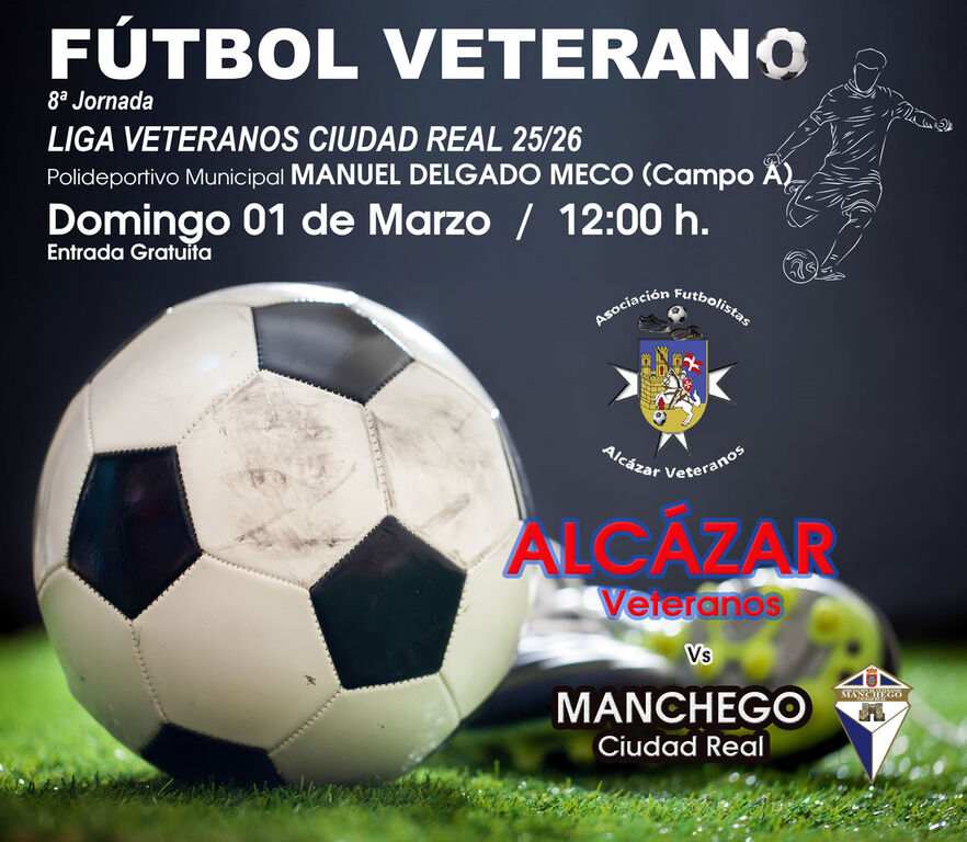 Este fin de semana, tenemos fútbol Veteranos. El Alcázar Veteranos afronta la octava jornada de la liga Veteranos de Ciudad Real 20025-2026, recibiendo este domingo a partir de las 12:00 horas en el municipal “Manuel Delgado Meco” al Manchego de Ciudad Real.