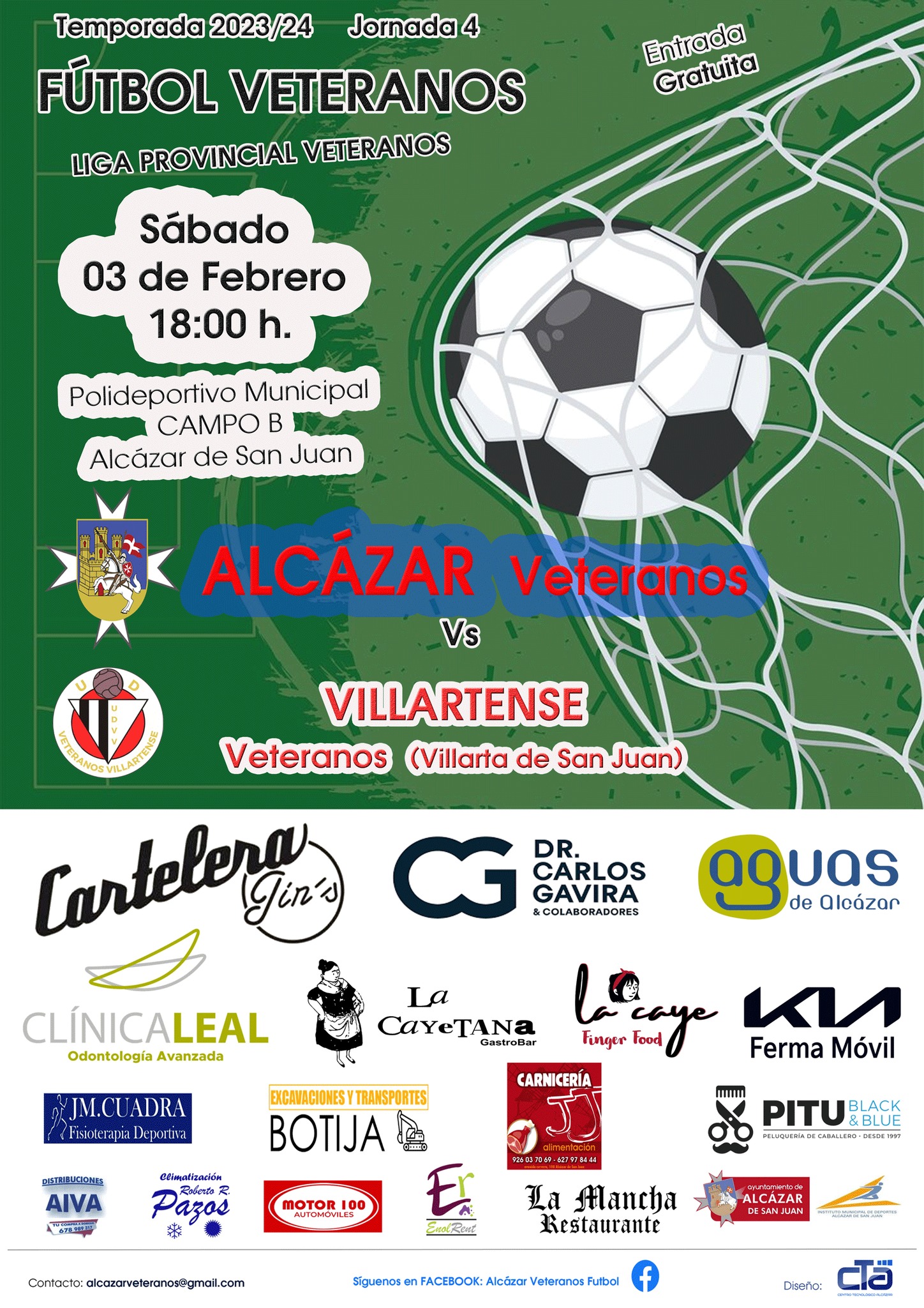 Este sábado, el equipo Alcázar Veterano juegan en casa, recibiendo a partir de las 18:00 horas en el campo B del complejo polideportivo municipal de Alcázar de San Juan al Villartense Veteranos (Villarta de San Juan), en partido correspondiente a la 4ª Jornada de la Liga Provincial de Futbol Veteranos - Grupo A.
