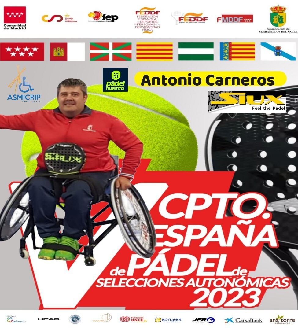 El padelista adaptado Antonio Carneros Lizano, regresa en este 2023 a la Selección Autonómica de Castilla-La Mancha de Pádel Adaptado, para disputar el próximo 10 de Marzo en la localidad madrileña de Serranillos del Valle, el Campeonato de España por Federaciones Autonómicas.