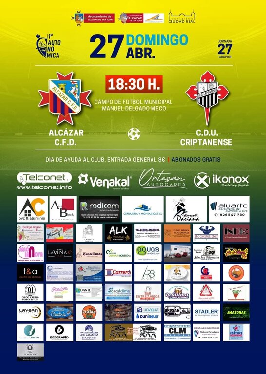 Este domingo, 27 de abril, a las 18:30 horas en el Municipal Delgado Meco de Alcázar de San Juan, se disputará el partido de fútbol de la Jornada 27 de la Primera Autonómica, entre los equipos Alcázar CFD vs CDU Criptanense, ambos conjuntos encuadrados en el grupo 2 de la citada categoría. El partido será dirigido por el colegiado Alejandro Almodóvar Pérez. En la ida, se impuso el conjunto de Campo de Criptana por 3 goles a 1.
