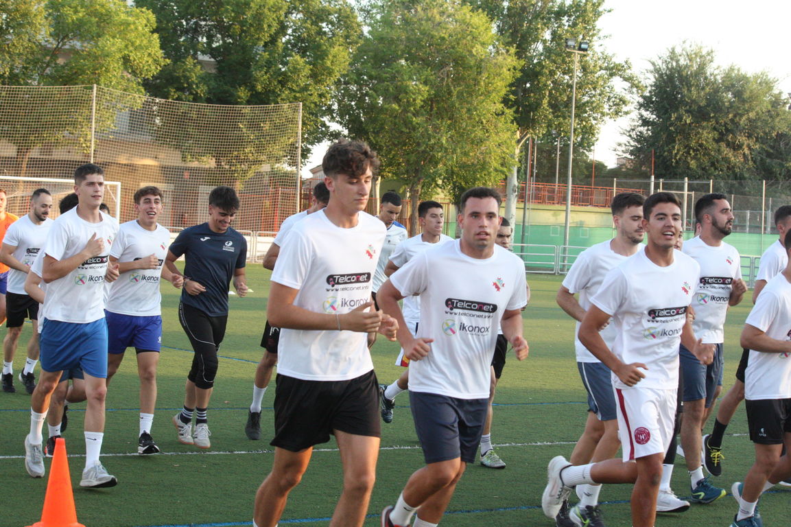 En esta primera sesión, asistieron la mayor parte de la plantilla, a excepción de algún jugador por motivos personales, típicos de esta época estival, y ocho jugadores a prueba, que pronto comenzaron a tocar balón y hacer unos ejercicios específicos preparados, mientras que el resto de compañeros calentaba y corría por el césped artificial. A esta primera sesión, también asistieron varios miembros de la Junta Directiva, con su presidente, Luis Molina a la cabeza, quien quisieron mostrar todo su apoyo a la plantilla y cuerpo técnico en este primer día de curso.