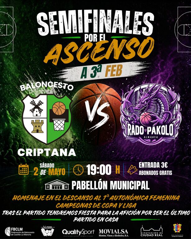 Este sábado a partir de las 19:00 horas en el pabellón municipal de Campo de Criptana, nos espera un sábado apasionante en el Pabellón Municipal. Por primera vez, se va a disputar una semifinal por el ascenso a 3ª FEB. Tras ganar el primer partido en Almansa por 66-69, el equipo criptanense, podría hacer historia y meterse en la final y por lo tanto, obtener el ascenso de categoría directo.