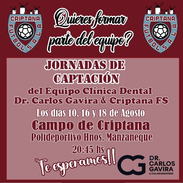 El Club Clínica Dr. Carlos Gavira & Criptana FS sale a la luz públicamente, y es que, de nuevo, en Campo de Criptana vuelve el Fútbol Sala Federado. “Llevamos un tiempo planeando dicho club y gracias a todas las colaboraciones que hemos tenido y en especial a la Clínica Dr. Carlos Gavira podemos hacer de este proyecto una realidad”, según explican los organizadores en un comunicado de prensa.