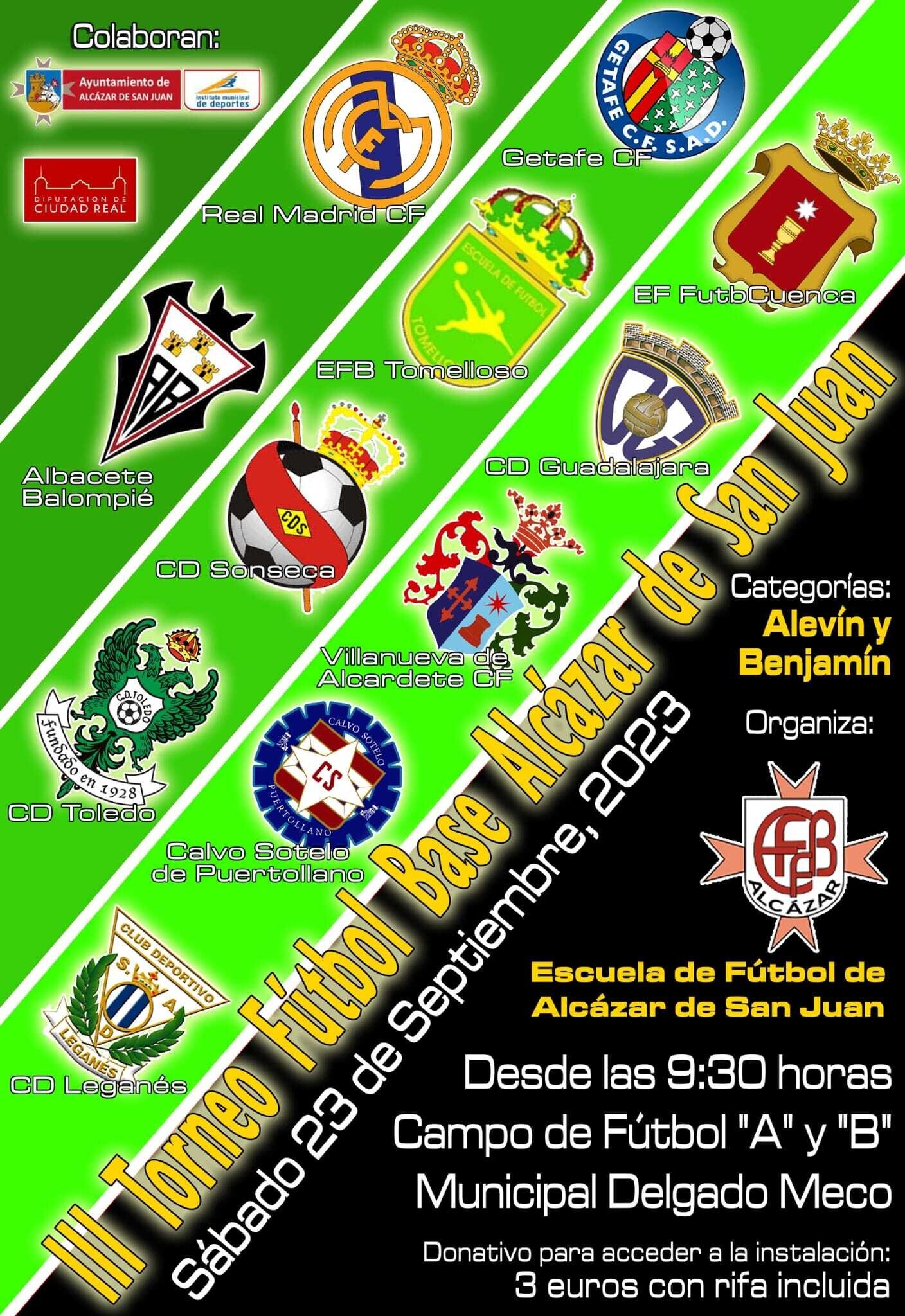 La Escuela de Futbol Base de Alcázar de San Juan en colaboración con el Ayuntamiento de Alcázar de San Juan e Instituto Municipal de Deportes, organiza la tercera edición del Torneo de Fútbol Base de Alcázar de San Juan. Un importante evento de fútbol de cantera, que contará con los equipos alevines de clubes de categoría profesional como Real Madrid, Getafe, Albacete Balompié y Leganés entre otros. También estarán presentes en Alcázar los mejores alevines de clubes y escuelas de fútbol a nivel regional