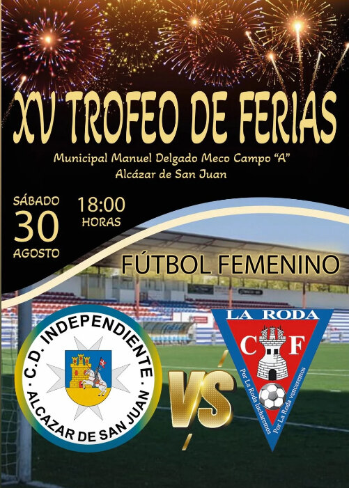 En los días previos a la Feria y Fiestas de la localidad, comienzan los tradicionales Trofeos de Feria y Fiestas y el primero en llegar será el del CD Independiente Alcázar, que recibirá, a partir de las 18:00 horas del sábado 30 de agosto, en el municipal “Manuel Delgado Meco” y con arbitraje de Felipe Gallego Gordillo que estará asistido por Francisco J. Campos Lara y Rubén Sánchez Correas a La Roda CF.