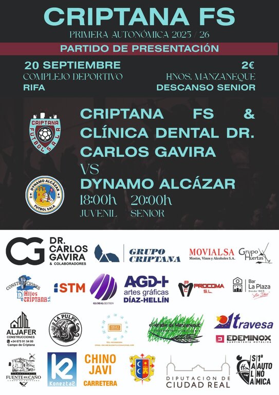 La cita comenzará a las 18:00 horas con el partido entre los equipos juveniles de ambas entidades. Posteriormente, a las 20:00 horas, será el turno del equipo senior, que esta temporada compite bajo la denominación Criptana FS & Clínica Dental Dr. Carlos Gavira, principal patrocinador del club.