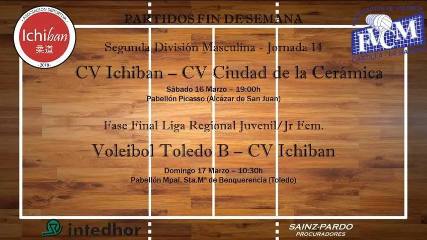 Por su parte, el equipo juvenil femenino del CV Ichiban, empieza la fase final con una eliminatoria a doble partido frente a Voleibol Toledo B. El domingo toca desplazarse hasta la capital regional para afrontar la ida de este enfrentamiento, que tendrá lugar a partir de las 10:30 horas en el pabellón municipal de Santa María de Benquerencia. La vuelta se realizará en Alcázar el próximo día 6 de Abril, a las 17:30h.