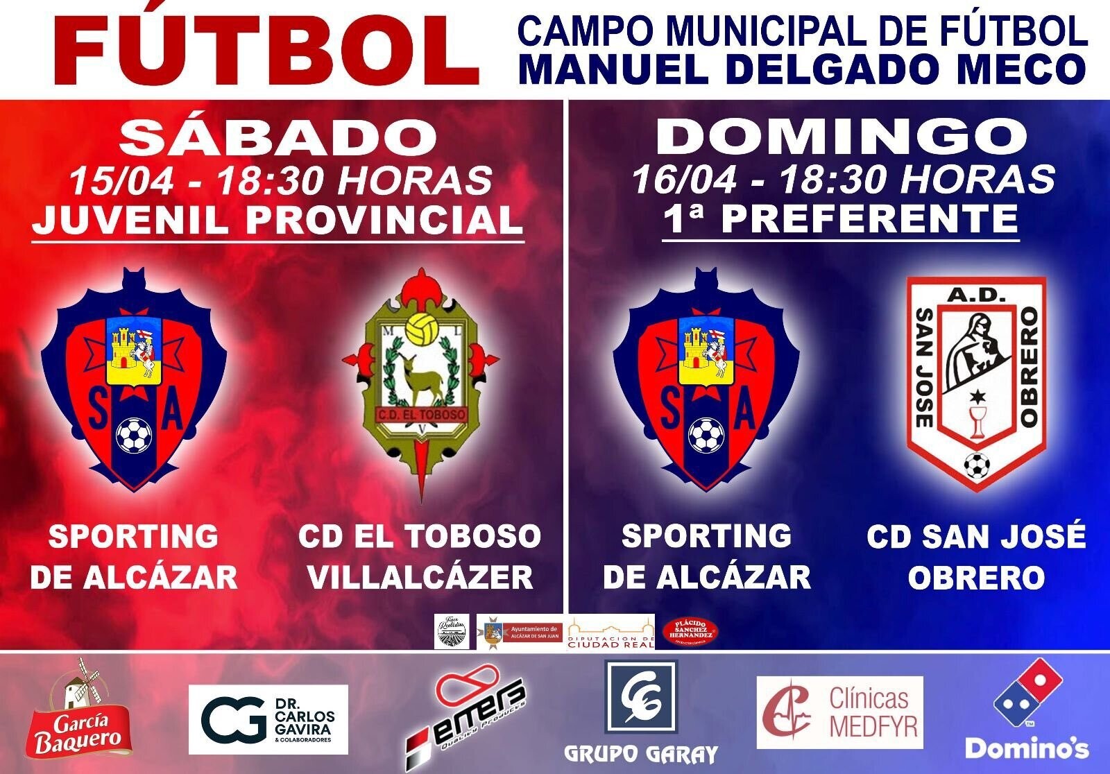 En lo que respecta a los dos equipos juveniles del Sporting de Alcázar, indicar que el juvenil preferente, que prácticamente tiene asegurada la segunda plaza y la disputa del play-off de ascenso a la liga juvenil nacional, se desplazará hasta la localidad ciudadrealeña de Bolaños de Calatrava donde a partir de las 17:00 horas en el municipal bolañego, con arbitraje de Víctor Manuel Gallego Rodríguez, se medirá al CD Bolañego.