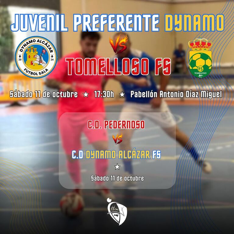 Sábado de fútbol-sala con dos espectaculares partidos, uno en casa y otro a domicilio para los equipos del Dynamo Alcázar Fútbol-Sala. Doble cita liguera. El juvenil preferente y tras su brillante victoria en Balazote por 6 goles a 8, recibe este sábado a partir de las 17:30 horas, en derbi comarcal, que arbitrará el pedroteño Javier J. Panduro Villegas con Miguel Javier García Muñoz, al Tomelloso FS en el pabellón Antonio Díaz-Miguel