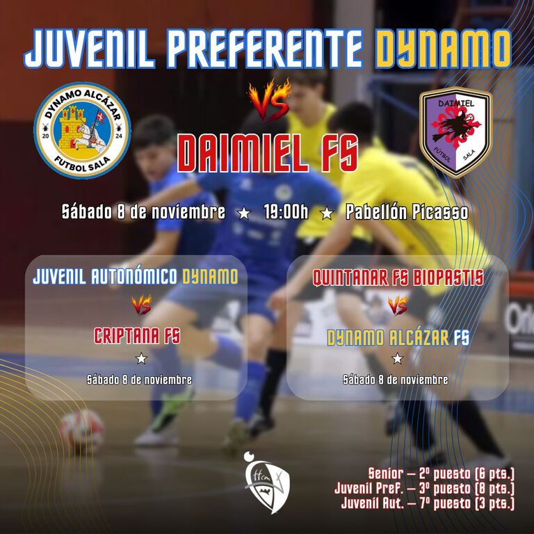En casa, doble jornada con dos partidos juveniles en la tarde del sábado. A partir de las 17:00 horas, en el pabellón Pablo Ruiz Picasso, el juvenil Autonómica del Dynamo Alcázar FS, recibirá al Criptana FS Clínica Dr. Gavira con arbitraje de Ángela Romero Mora que estará asistida por Lucas Lillo Sánchez-Mateos.