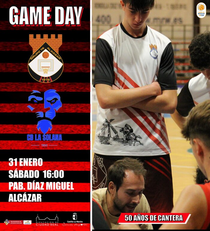 A primera hora de la tarde del sábado, el júnior autonómico UCLM U18, Grupo Normex Grupo 76 Alkasar, segundo clasificado con 10 victorias y 1 derrota, recibirá a partir de las 16:00 horas en el Díaz-Miguel con arbitraje de Roberto Martínez Brito y Victoria Motovylo Boyarchuk al Bar La Paloma CB La Solana, noveno clasificado con 1 victoria y 11 derrotas.