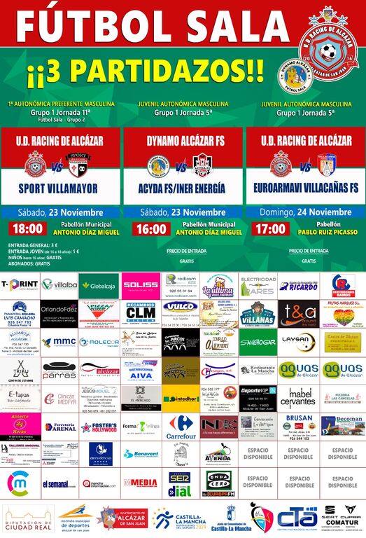 Nueva jornada liguera para los equipos alcazareños en la modalidad Fútbol-Sala. Tanto los dos equipos del Racing de Alcázar, senior y juvenil, como el juvenil del Dynamo Alcázar, juegan como locales en Alcázar de San Juan, además en la jornada matinal del sábado, cuatro equipos de la Escuela Deportiva de Fútbol-Sala del Dynamo Alcázar FS, jugarán en casa cómo locales, durante toda la jornada matinal del sábado, en el Pabellón Pablo Ruiz Picasso.