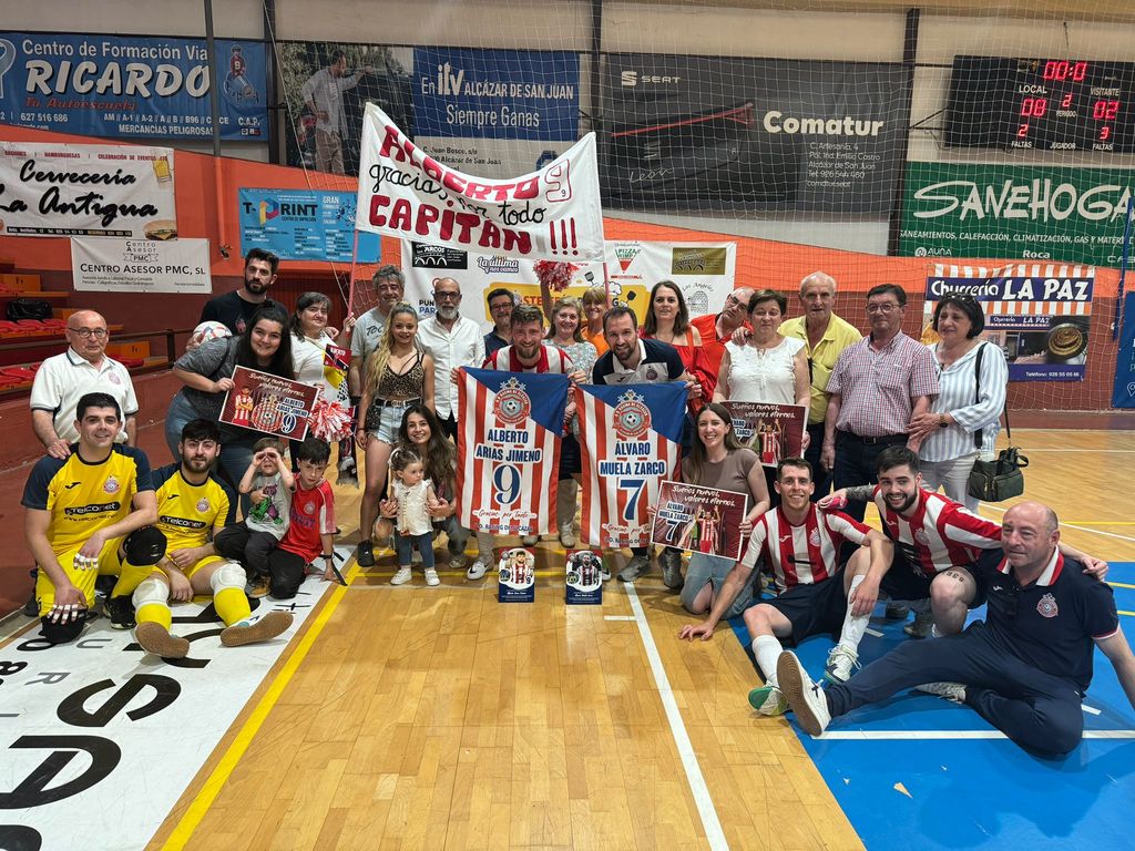 Tras el pitido final, llegaron los momentos de alegría, emoción, júbilo por la victoria y por despedir a dos baluartes del fútbol-sala alcazareño, dos históricos que recibieron todo el cariño y apoyo de su afición, de sus compañeros y el reconocimiento de todos los presentes en el Díaz-Miguel. Tras ser manteado Alberto, momento de las fotos para el recuerdo entre familiares, compañeros, amigos y celebración como se merece para decir adiós a dos jugadores que han dejado una huella imborrable en este deporte en Alcázar de San Juan.