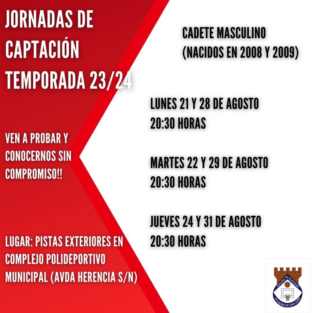 El Grupo 76 Alkasar, también ha hecho públicas unas jornadas de captación para jugadores y jugadoras en edad cadete e infantil. Inicio de entrenamientos para categorías infantil y cadete. Vente a entrenar y prueba sin compromiso. En los entrenamientos se dará la información de horarios de la temporada y se empezaran a confeccionar los equipos.