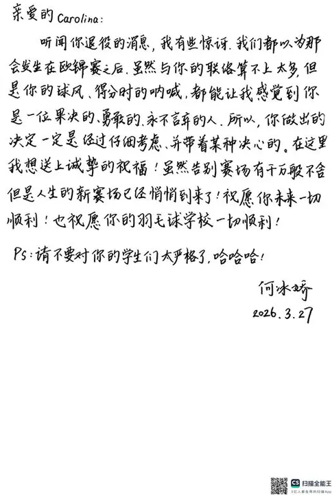 “Tu estilo de juego y tus gritos al ganar cada punto me hacían sentir que eres una persona decidida, valiente y que nunca se rinde. Por eso, estoy segura de que tu decisión ha sido muy meditada y tomada con gran determinación”, escribió He Bingjiao al inicio de su carta. Y añadió: “¡Quiero enviarte mis más sinceros deseos! Aunque despedirse de las pistas deja un vacío enorme, ¡el nuevo ‘partido’ de tu vida ya ha comenzado discretamente! Te deseo lo mejor en todo lo que venga: ¡y mucho éxito con tu escuela de bádminton!”. Para acabar, la jugadora china recuerda la rivalidad de Carolina con el resto de jugadoras en la pista y le pide, en tono de broma: "PD: Por favor no seas demasiado estricta con tus alumnos!".