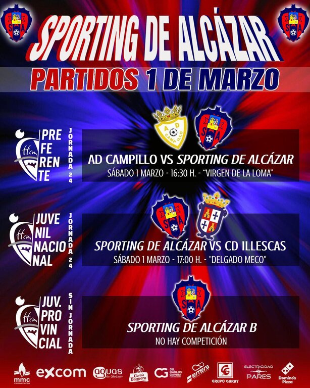 Este sábado, el juvenil nacional del Sporting de Alcázar recibirá a partir de las 17:00 horas, con arbitraje de Álvaro Gómez-Miguel González que estará asistido por Adrián Verbo García e Ilyas Nasroallah Hallioui, en el municipal Manuel Delgado Meco al CF Illescas, séptimo clasificado con 38 puntos, que viene de vencer 4-1 a La Roda UD. Será otra prueba de fuego para un equipo que no deja de luchar por la permanencia. Por su parte, el juvenil autonómico, tendrá jornada de descanso por el Carnaval.
