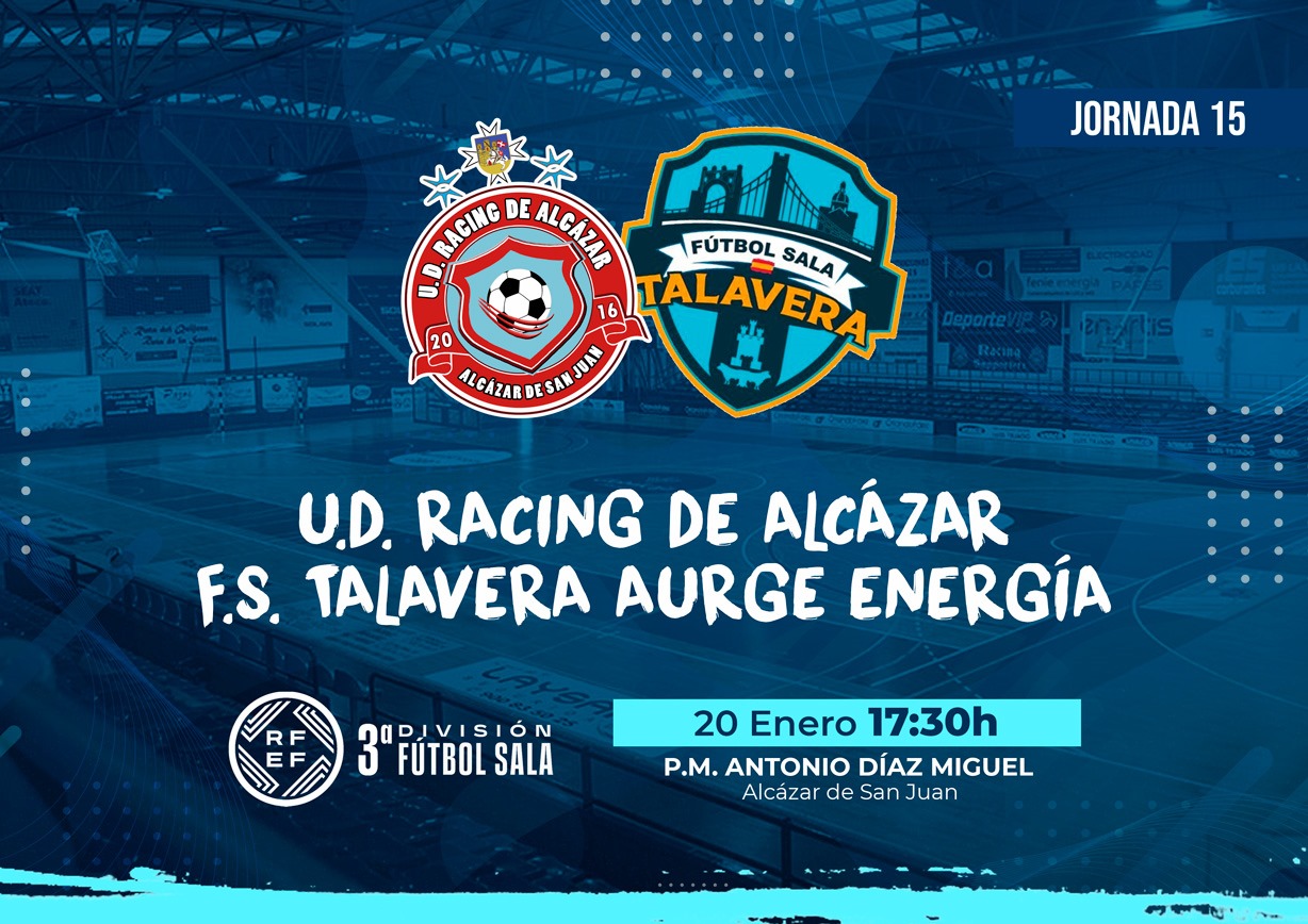 El equipo de Tercera División del Racing de Alcázar, recibirá este sábado a partir de las 17:30 horas, en el último partido de la primera vuelta de la competición, con arbitraje de los conquenses, Noel de Julián Cañada y Álvaro Recuenco Jiménez, en el pabellón Antonio Díaz-Miguel, al FS Talavera Aurge Energía.