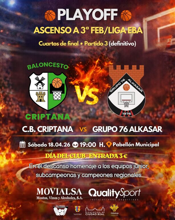 Fin de semana marcado por importantes, determinantes y decisivos compromisos para los equipos del Grupo 76 Alkasar y Movialsa QualitySport Criptana. En la primera nacional masculina, ambos equipos disputarán el tercer y definitivo partido de cuartos de final del playoff de ascenso a la Tercera FEB, este sábado desde las 19:00 horas en el pabellón municipal de Campo de Criptana, con arbitraje de Pedro Parra Mingallón y Alberto Copeiro de Villar Verdejo.