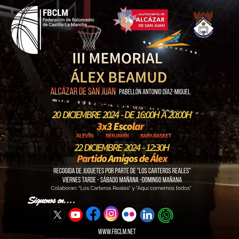 La Federación de Baloncesto de Castilla-La Mancha, el Instituto Municipal de Deportes de Alcázar de San Juan y el Grupo 76 Alkasar han organizado, de manera conjunta, la tercera edición del Memorial Álex Beamud. Un evento deportivo en el que se recordará al que fuera jugador y entrenador del club alcazareño y en el que estará muy presente la amistad y la solidaridad, los próximos 20 y 22 de diciembre de 2024.