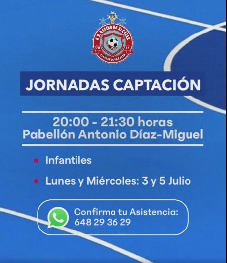 El CD UD Racing de Alcázar ha convocado unas jornadas de captación para jugadores de fútbol-sala en categorías infantil y cadete para la próxima semana. Estas jornadas se desarrollarán de 20:00 a 21:30 horas en el pabellón Antonio Díaz-Miguel. El lunes y miércoles será el turno para los infantiles y el martes y jueves, turno para los cadetes.