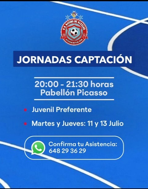 El CD UD Racing de Alcázar ha convocado unas jornadas de captación para jugadores de fútbol-sala en categoría juvenil para esta próxima semana. Estas jornadas se desarrollarán de 20:00 a 21:30 horas en el pabellón Pablo Ruiz Picasso (Parque), los próximos martes y jueves.