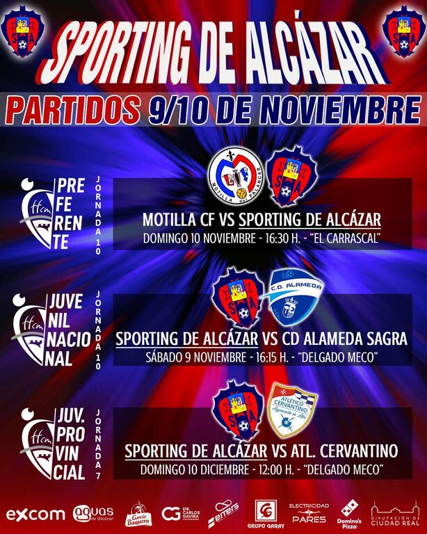 Doble compromiso del juvenil del Sporting de Alcázar en el Manuel Delgado Meco. Intenso fin de semana en el Delgado Meco de Alcázar de San Juan con doble partido para los juveniles del Sporting de Alcázar. El Nacional recibe este sábado a CD Alameda de la Sagra, equipo que es 6º con 14 puntos y que viene de ganar sus dos últimos partidos, 0-3 ante Jesús de la Ossa y 3-0 contra La Roda UD. Por su parte, el conjunto alcazareño tiene la necesidad imperiosa de sumar puntos en su feudo ya que ha sumado 2 puntos de los últimos 15 disputados, por lo que debe de volver ‘en positivo’ ante un rival que tratará de sacar provecho del bache sportinguista.