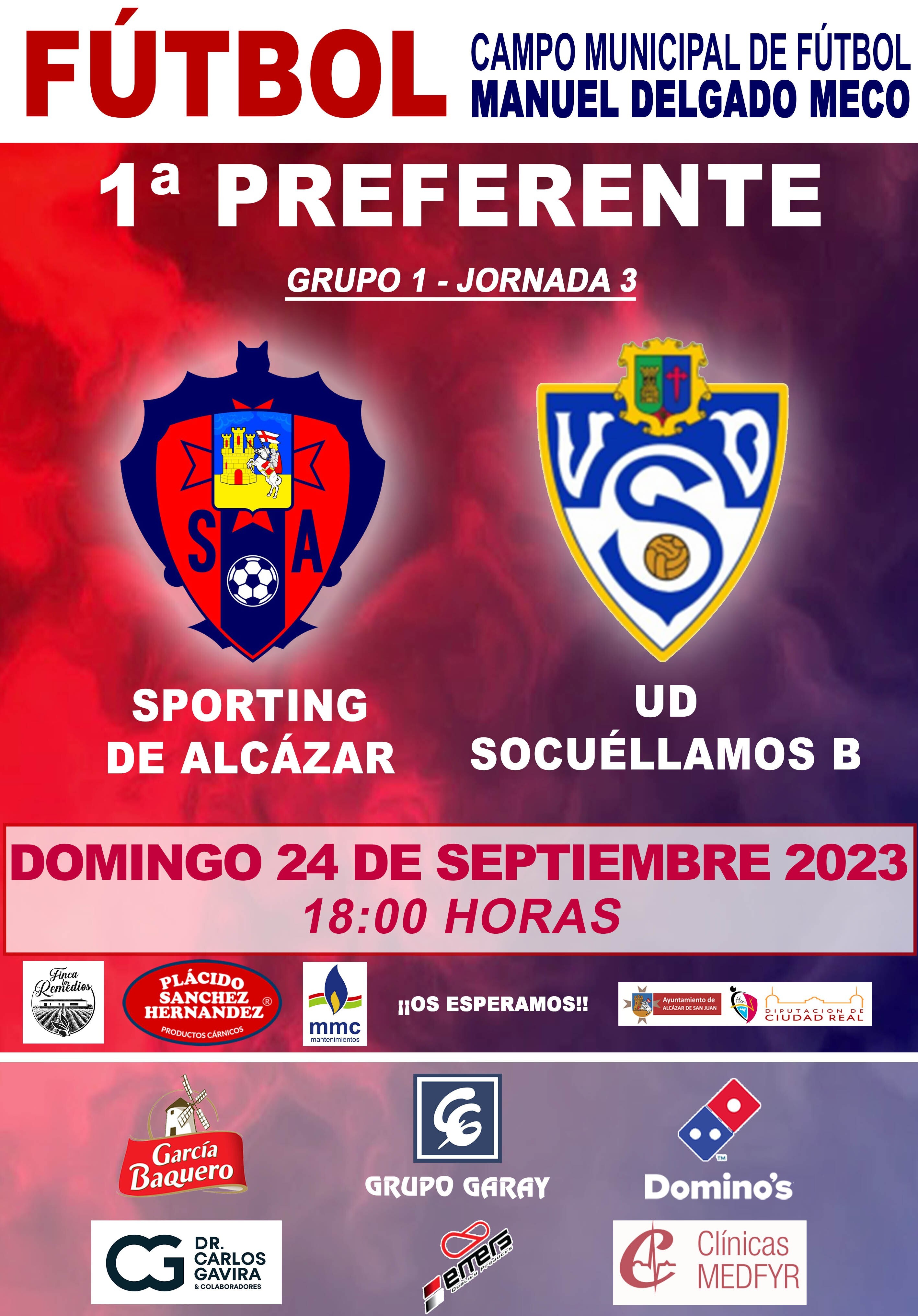 Tras las dos primeras jornadas de liga sin poder puntuar en casa ante Manzanares y a domicilio en Almansa, el equipo de Primera División Autonómica del Sporting de Alcázar recibe este domingo a partir de las 18:00 horas en el municipal “Manuel Delgado Meco” a la UD Socuéllamos B con arbitraje de Mario García de la Camacha Díaz que estará asistido por Diego Herrera Galán y Ramses Fuertes Calahora.
