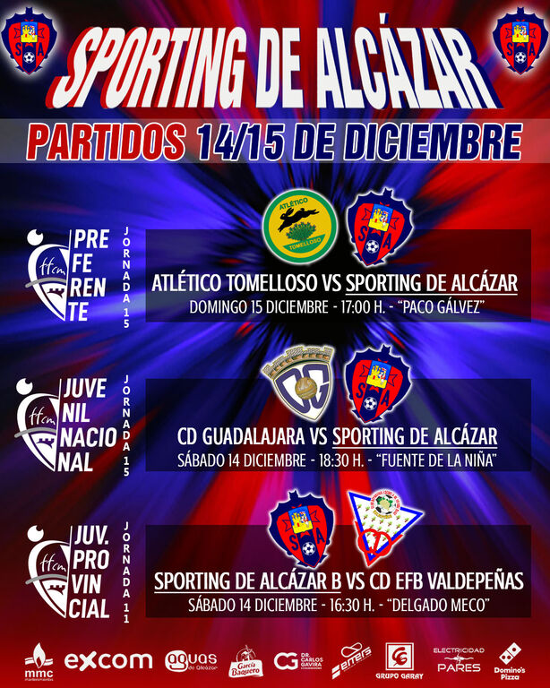 La penúltima jornada del año en curso, viene marcada por tres interesantes encuentros ligueros con muchísimo en juego. El equipo de primera autonómica preferente del Sporting de Alcázar, visitará este domingo el municipal Paco Gálvez para medirse a partir de las 17:00 horas, con arbitraje de Carlos Sandoval Marchante que estará asistido por Unai Quintana García y Santiago Lozano Gómez Recuero, al Atlético Tomelloso.