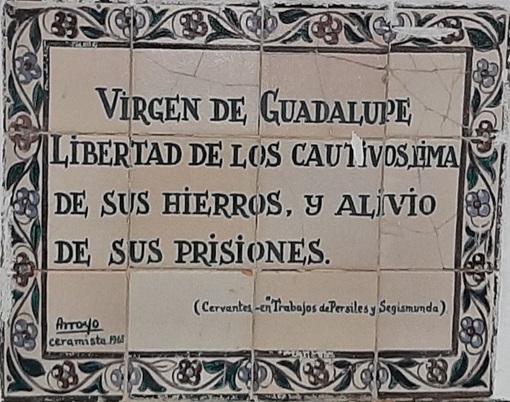 “Al venir a redimirse a los pies de la Virgen Santísima, después de su cautiverio en Argel y ofrecerle sus cadenas, inmortalizó esta histórica villa de Guadalupe”