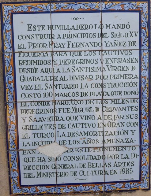 Una antigua tradición guadalupina dice: “Desde este humilladero vieron por primera vez el monasterio muchos peregrinos, entre los que estuvo Miguel de Cervantes después de haber sido liberado de su cautiverio, para ofrecer sus grillos y cadenas a la Virgen de Guadalupe”.
