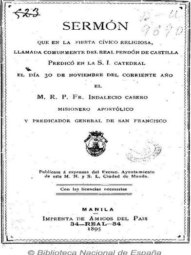 En la Biblioteca Nacional se conserva el Sermón que en la fiesta cívico religiosa, llamada generalmente del Real Pendón de Castilla, predicó en la S.I. Catedral de Manila el día 30 de noviembre de 1895. En mi opinión, es un deleite leer estas escasas 20 páginas, cuyo acceso gratuito pongo a vuestra disposición.
