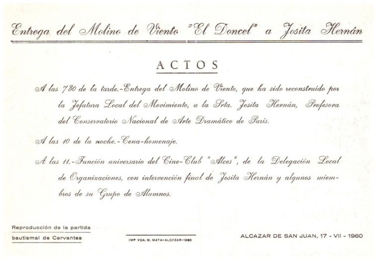 “Como continuación de los actos que tuvieron lugar el domingo en Alcázar de San Juan, donde, como es sabido, se hizo entrega a Josita Hernán, de un Molino de Viento, construido a expensas del Aula de Cultura y Obra Social de la Falange, para regalar a la ilustre actriz española, en pago a su acendrado amor a nuestra región manchega. Las alumnas del Conservatorio Nacional de Arte Dramático que Josita Hernán dirige en París representaron en el Teatro Crisfel de Alcázar algunas obras breves de Valle Inclán, Pio Baroja y Sor Juana Inés de la Cruz…”