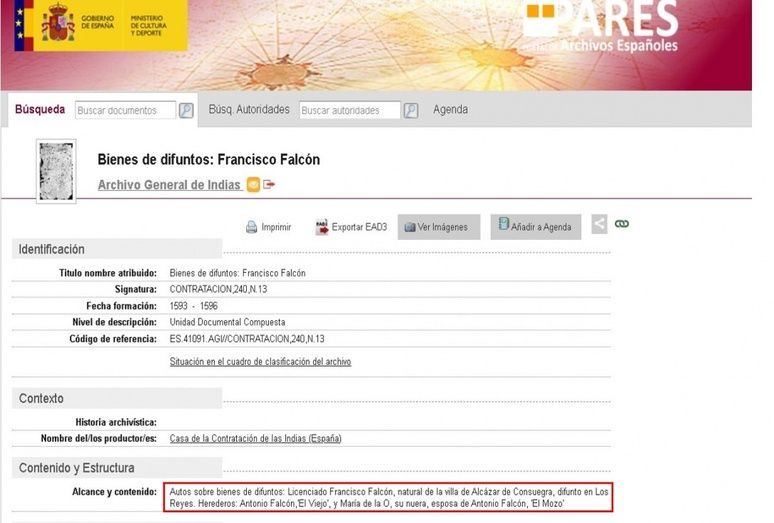 Fig. 4. Captura de pantalla de Archivo de Indias digitalizado signatura CONTRATACIÓN, 240, N 13. En el Epígrafe Contenido y estructura se puede leer el nombre de los herederos de su protocolo de Testamento. D. Antonio Falcón “el Mozo” podría ser su hijo, pues María de la O era su nuera y esposa de Antonio Falcón... Las referencias apuntan a que murió sin descendencia. La duda está servida.