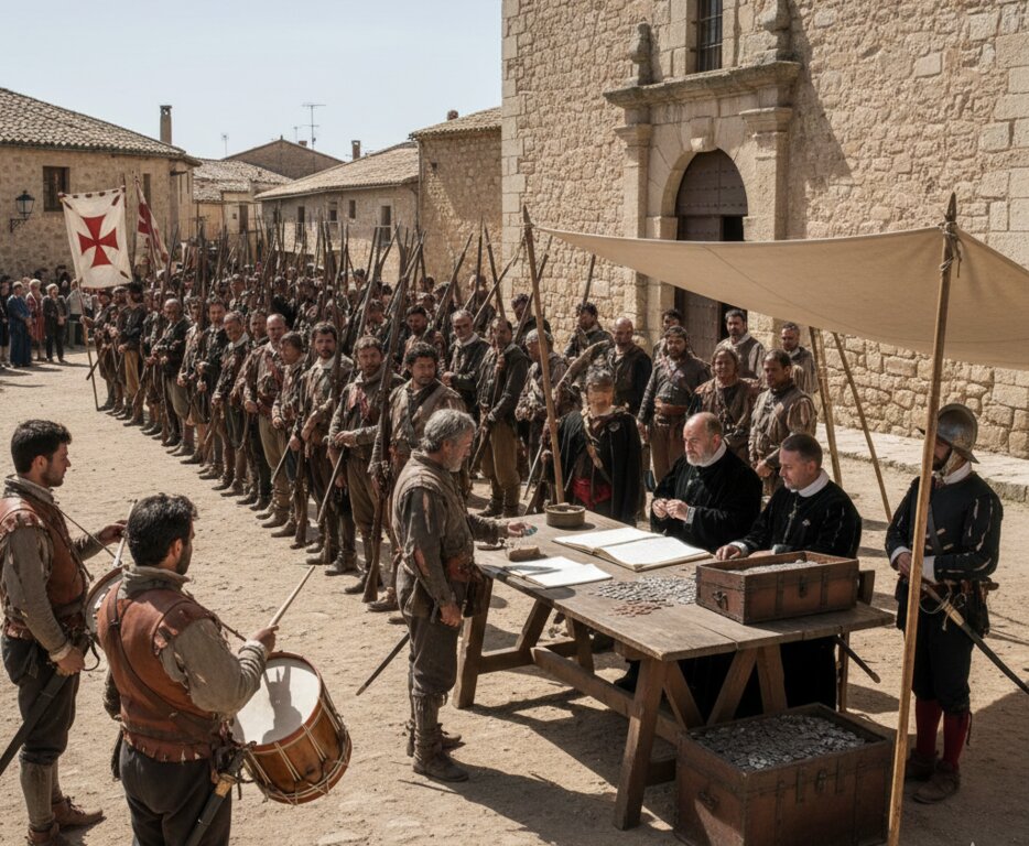 El comisario real don Pedro de Vargas los llama uno a uno. El pagador Pedro de Miranda desembolsa los reales en mano. Nadie cobra si no está presente. Lo que un escribano anotó ese día con tinta y pulso firme es hoy una ventana abierta al corazón militarizado de la España de los Austrias.