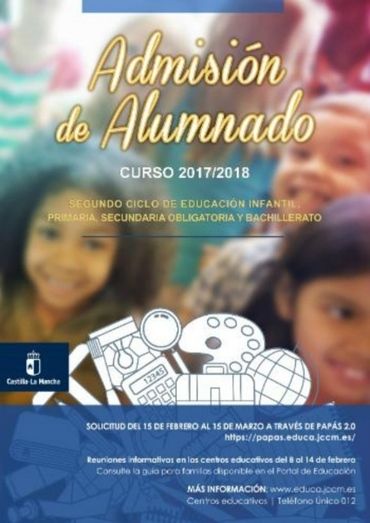 El día 3 de febrero de 2017 ha sido publicada la convocatoria de admisión de alumnado para el curso escolar 2017/2018 en centros que imparten las enseñanzas de segundo ciclo de Educación Infantil, Educación Primaria y Educación Secundaria Obligatoria y Bachillerato.